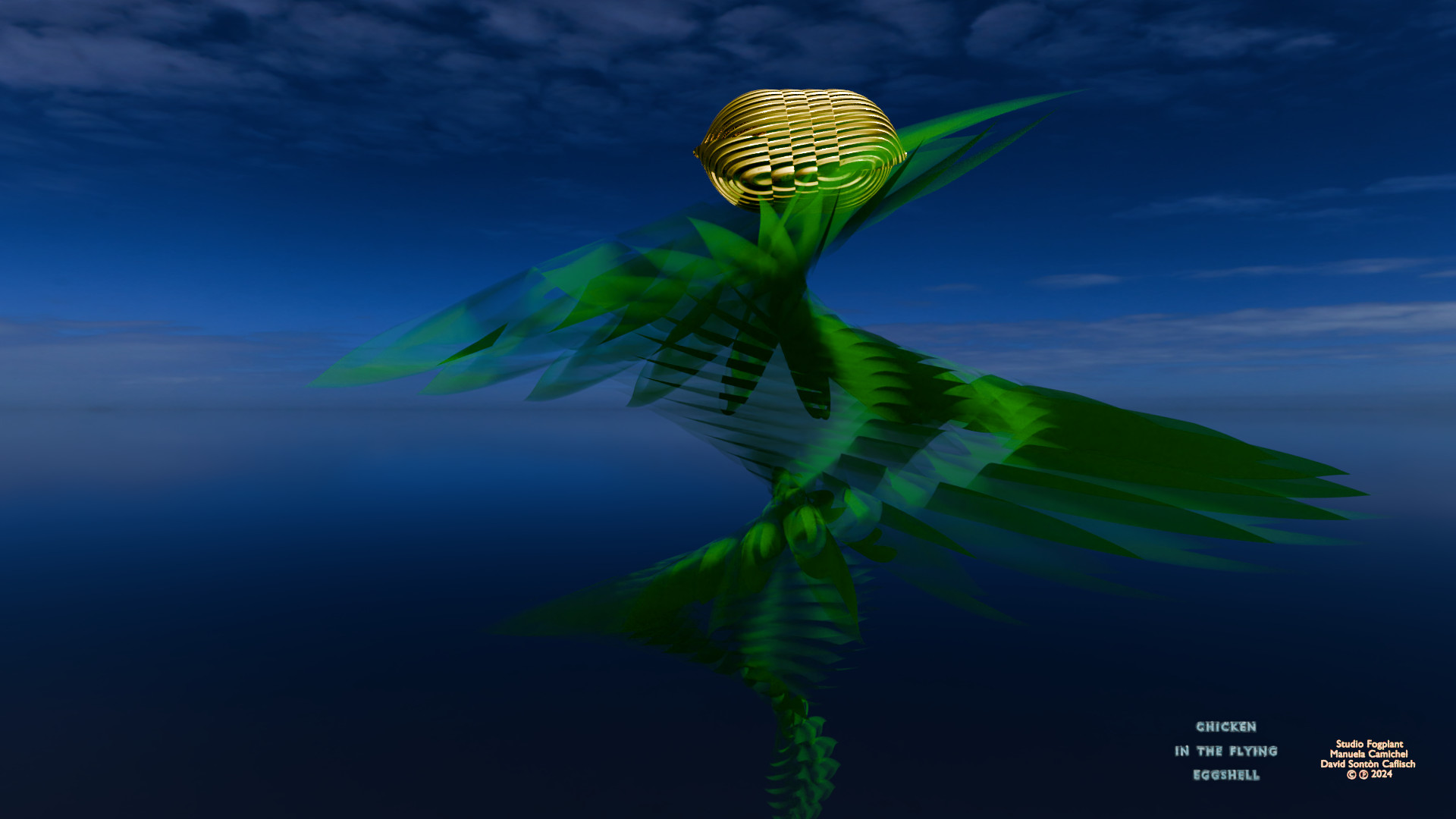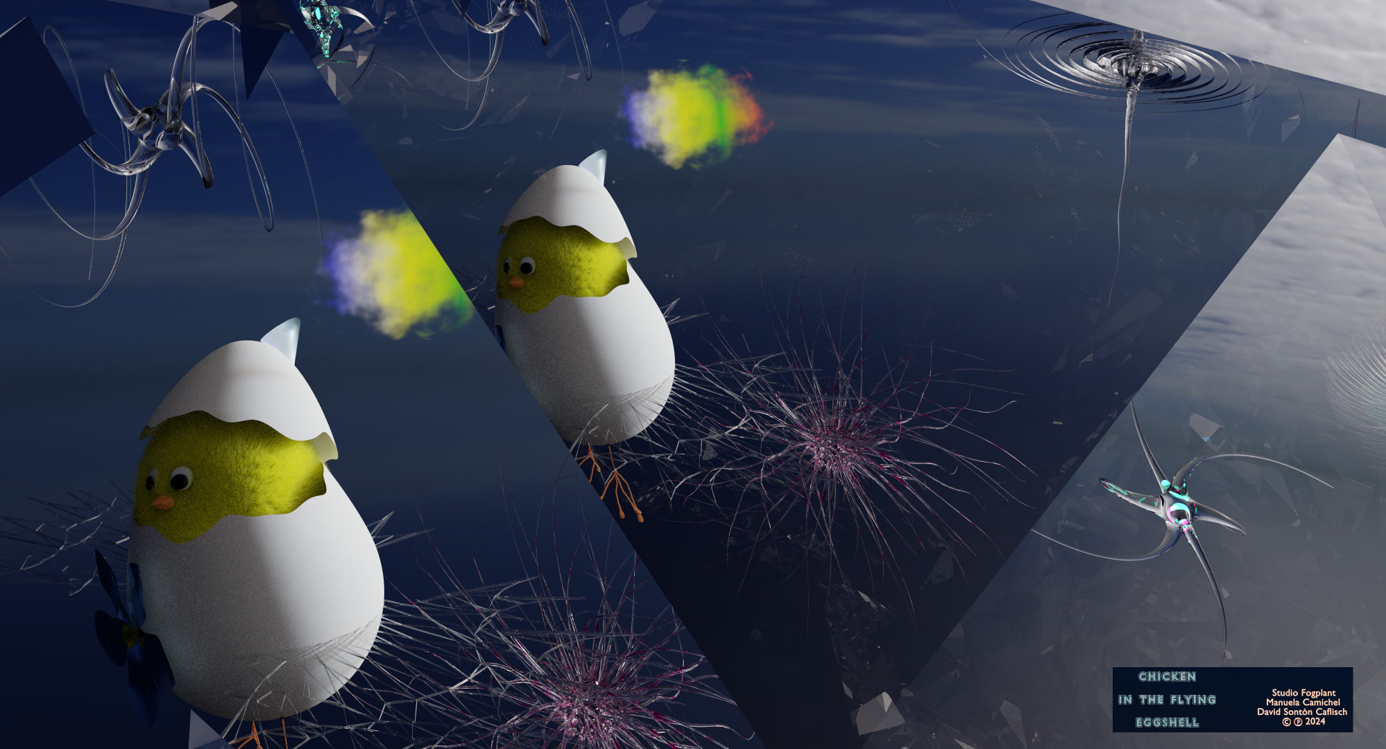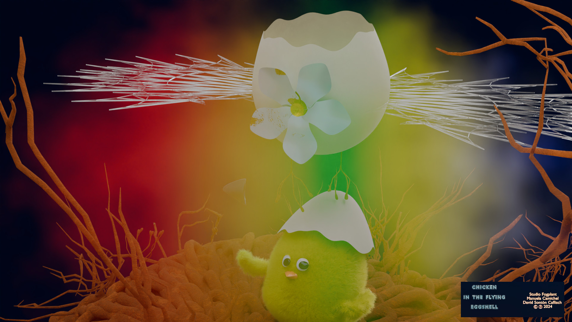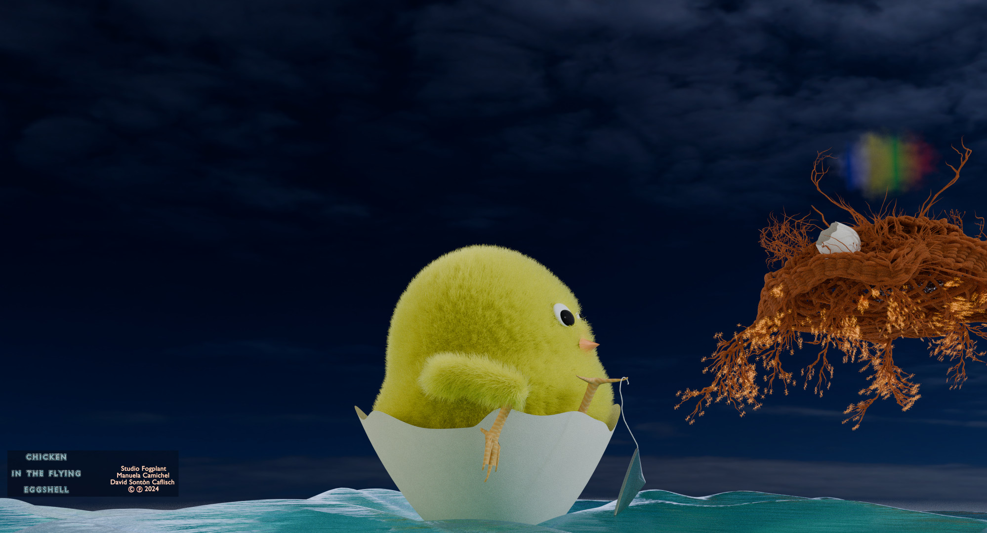 A poetic contemplation on Buddhist teachings featuring a chicken traveling through a dreamlike world, meeting friends and using the eggshell to fly.